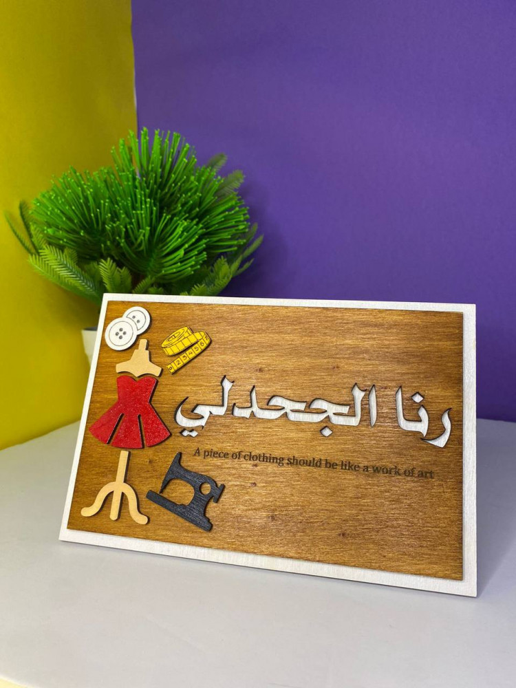 تفصيل ستاند خشب ديكور يجسد التميز والاحترافية يأتي بتصميم فريد على شكل لوحة تحمل الاسم وجملة مختارة تعكس رؤيته المهنية بلونه الخشبي الكلاسيكي.احصل عليه الأن من Wooder